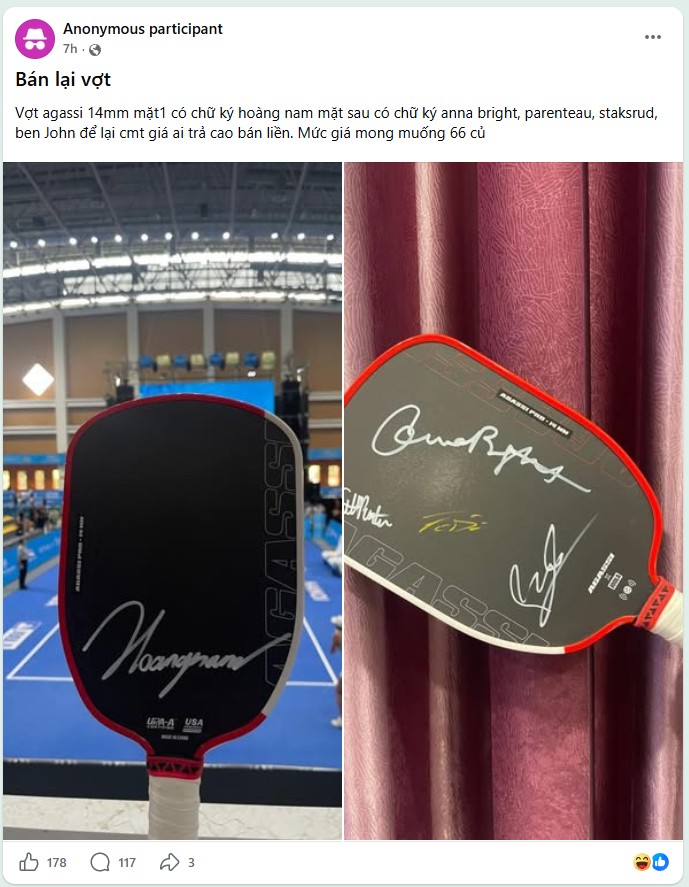 Một chiếc vợt pickleball có chữ ký của nhiều tay vợt nổi tiếng bất ngờ được rao bán với giá 66 triệu đồng sau giải PPA Hà Nội. Câu chuyện nhanh chóng gây tranh cãi, đặt ra câu hỏi về ranh giới giữa giá trị kỷ niệm và giá trị thương mại trong thể thao.