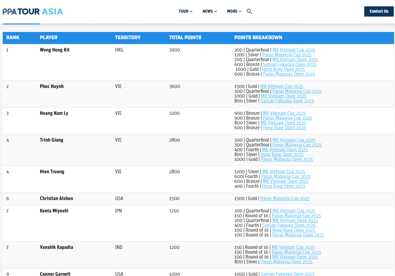 Trang xếp hạng PPA Tour Asia vừa công bố bảng điểm cập nhật tháng 10/2025, cho thấy một bước tiến mạnh mẽ của các tay vợt Việt Nam trên bản đồ Pickleball khu vực. Với 4 đại diện nằm trong nhóm dẫn đầu nội dung đơn nam, Việt Nam đang dần trở thành một trong những cường quốc mới nổi của Pickleball châu Á.