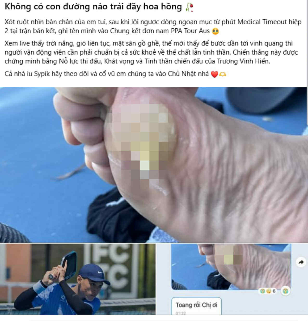 Trong giới thể thao, phồng rộp chân, đau rát, bong da hay chảy máu là tình trạng quen thuộc đối với các VĐV chuyên nghiệp, đặc biệt là ở những môn đòi hỏi cường độ di chuyển cao như pickleball. Nhưng với điều kiện thời tiết khắc nghiệt tại Australia, mức độ tổn thương của Hiển càng rõ rệt hơn.