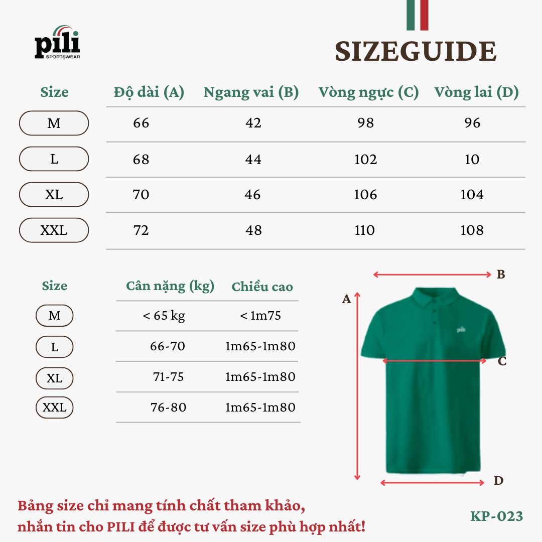 - Bảng size chỉ mang tính chất tham khảo, tùy thuộc vào số đo, cân nặng của cơ thể và chất liệu sản phẩm khác nhau sẽ có sự chênh lệch nhất định. Quý khách vui lòng cân nhắc kỹ giữa chiều cao và cân nặng để lựa chọn được size phù hợp nhất với dáng người của mình.